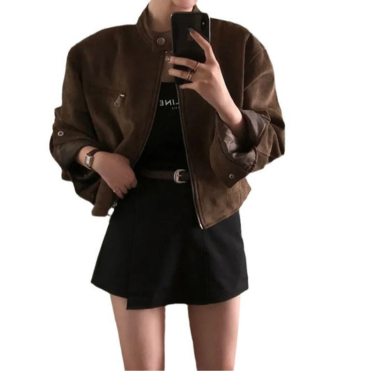 Retro Graceful Stand Collar Zipper Pocket Loose Versatile Short Jacket