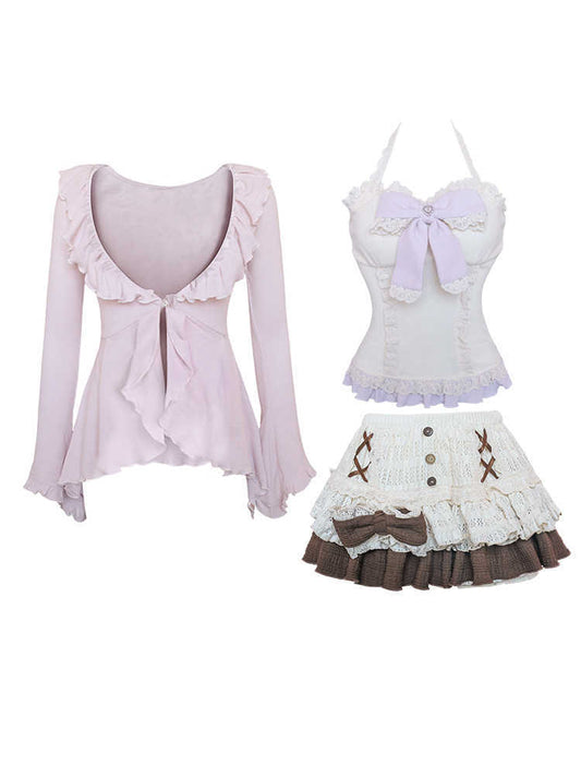 Apricot Knitted Sling Purple Knitted Cardigan Knitted Stitching Cake Dress
