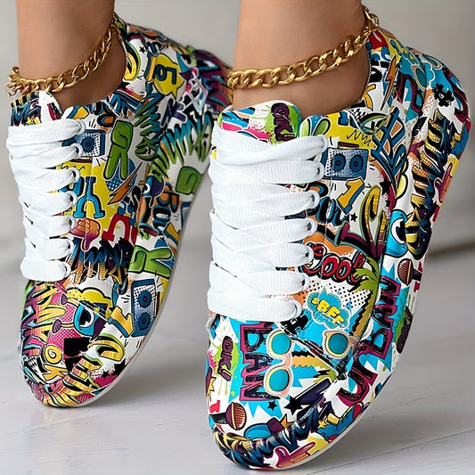 Womens Graffiti Art Sneakers - Stylish Lace-Up Platform Shoes with Comfortable Low Top Design - Perfect for Sports & Casual Wear - Fashionable Skate Style