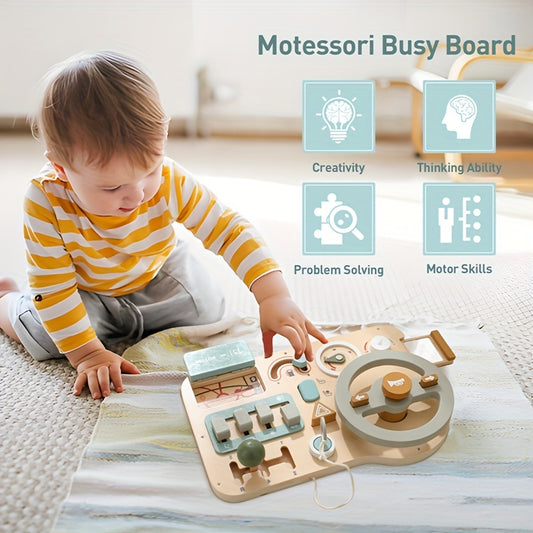 Wooden Steering Wheel Busy Board Toy - Educational Vehicle Sign Recognition, Problem Solving & Motor Skills Development for Youngsters, Light Green/Blue/Yellow, Smooth Burr-Free Plywood, Youngsters Learning Toy | Engaging Toy