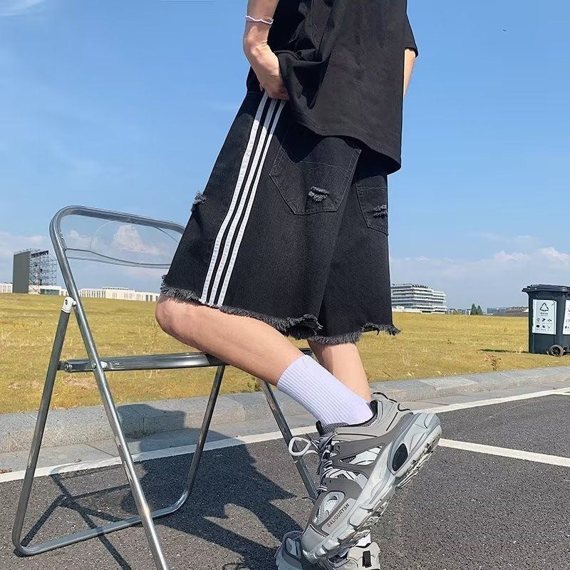 Ripped Denim Shorts Men's Retro Three-bar Pants Design Sense Niche Loose Large Trunks